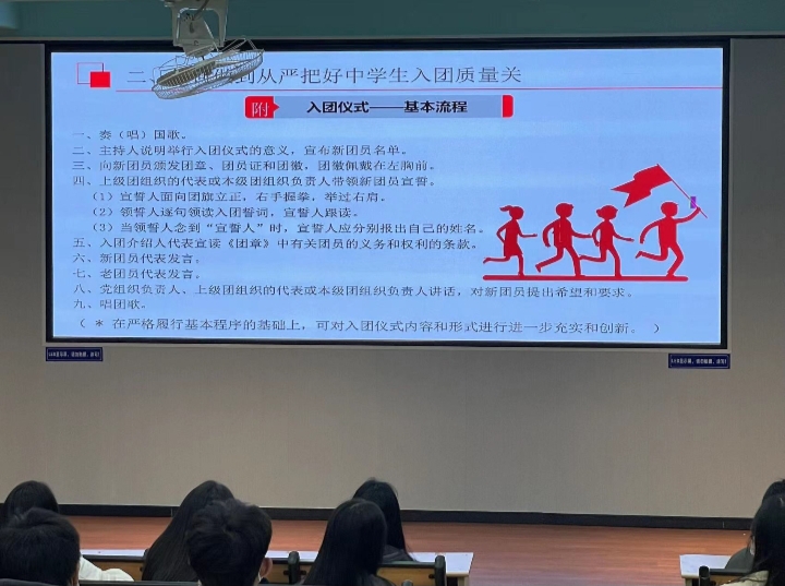 随后,吴世鹏同学还为同学们介绍入团仪式的基本流程,让在场的同学们能够清楚了解整个入团仪式,让同学们对团员发展有一个正确的认知。