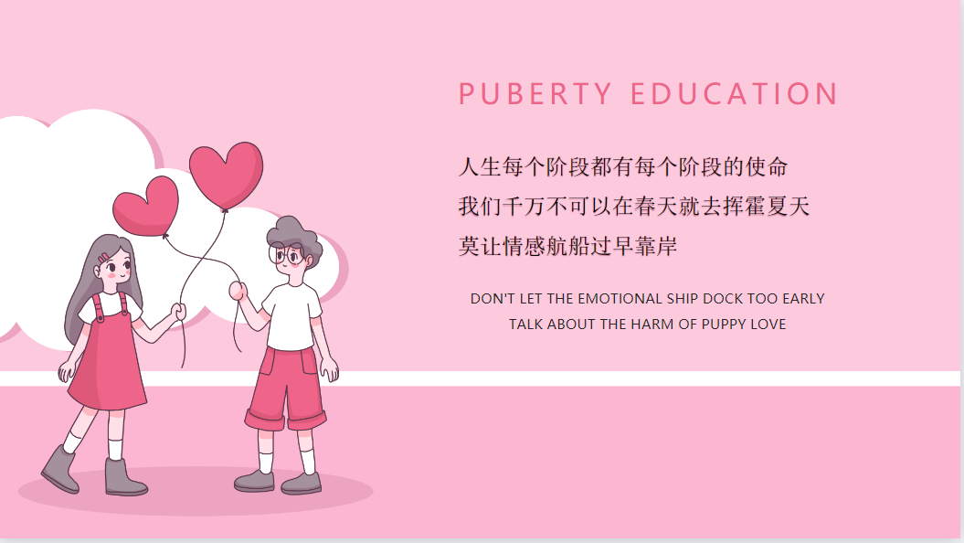 从儿童期过渡到青年期的生理和心理发育,大致要经历两小无猜期、两性疏远期、两性爱慕期和正式婚恋期。但有些青少年在两性疏远期中可能有另一种自然倾向﹣同性依恋。关于两性话题,老师给同学们提了几个小建议,让同学们学会正确认识自我情感、表达自我、学会如何正确调整自己的情感,也可以寻求他人的帮助,协助自己更好的渡过青春期。