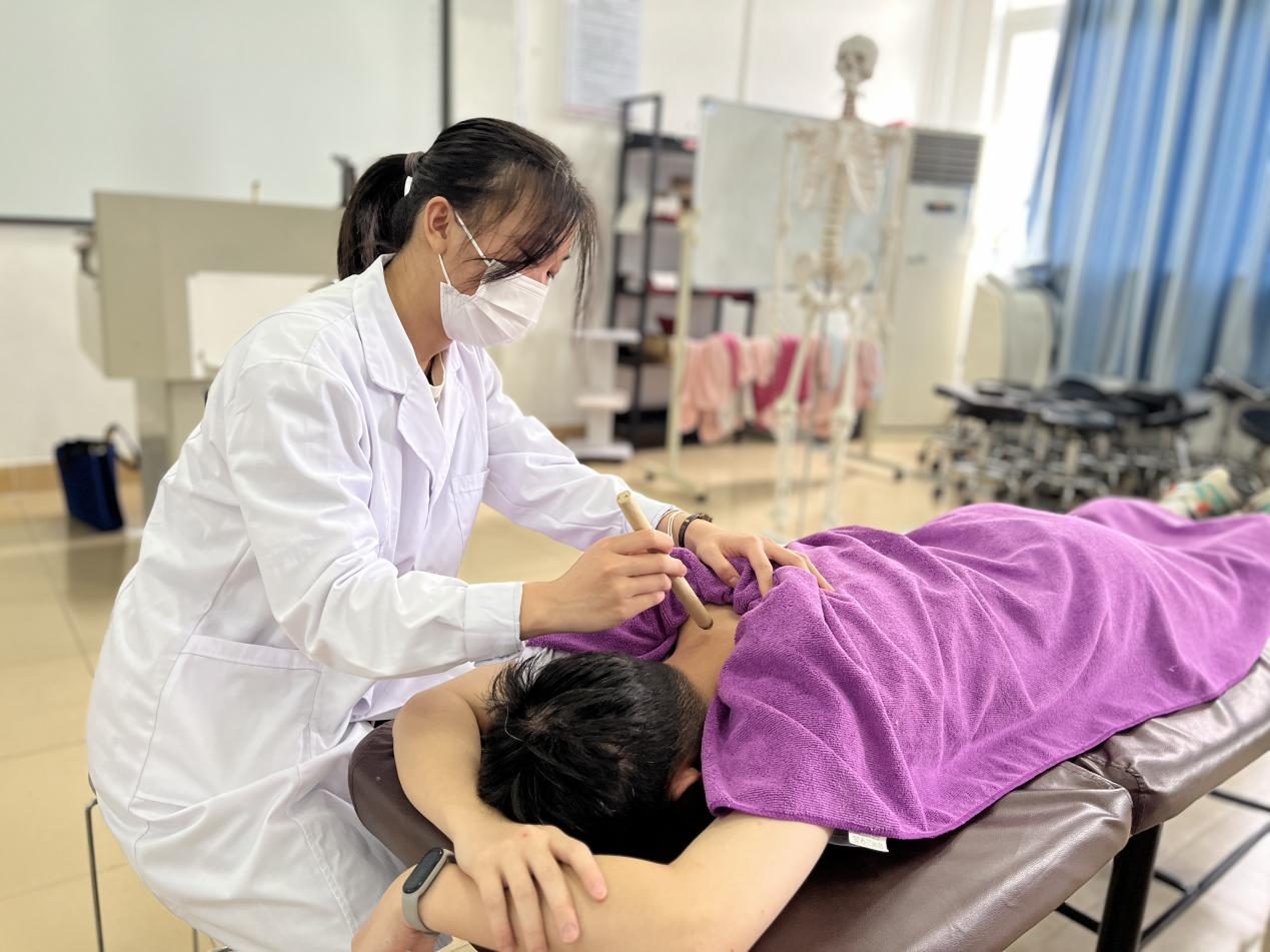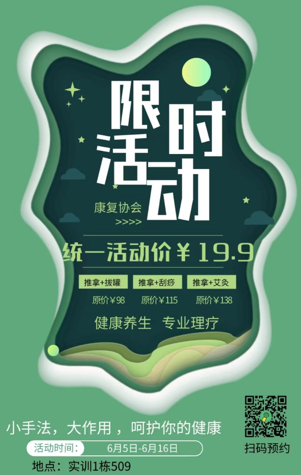 康复协会于5月15日至19日开展了为期一周的“推拿/刮痧/拔火罐/艾灸”主题公益活动,在校师生均可通过线上小程序预约进行免费体验,大家可以任意选择推拿+刮痧/拔火罐/艾灸两个体验项目。在活动开始的第一天,就受到了大家的广泛欢迎,时间段直接约满,截止报名时间,预约只剩下2个名额。且教职工也通过其他渠道来预约,最后协会活动名额约满,也有其他老师临时想来体验的,因为值班人员的安排不能给老师们提供服务,我们也期望老师们下一次活动的到来!