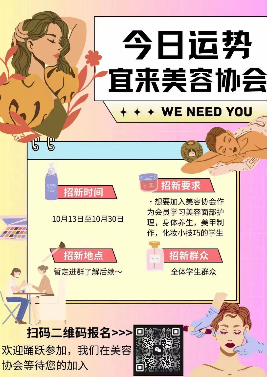 希望对美容抱有极大的兴趣与喜好的你,快来美容协会加入我们吧!遇到志同道合的朋友互相成就!有才有技的同学可以加入以下其中一个部门哦!