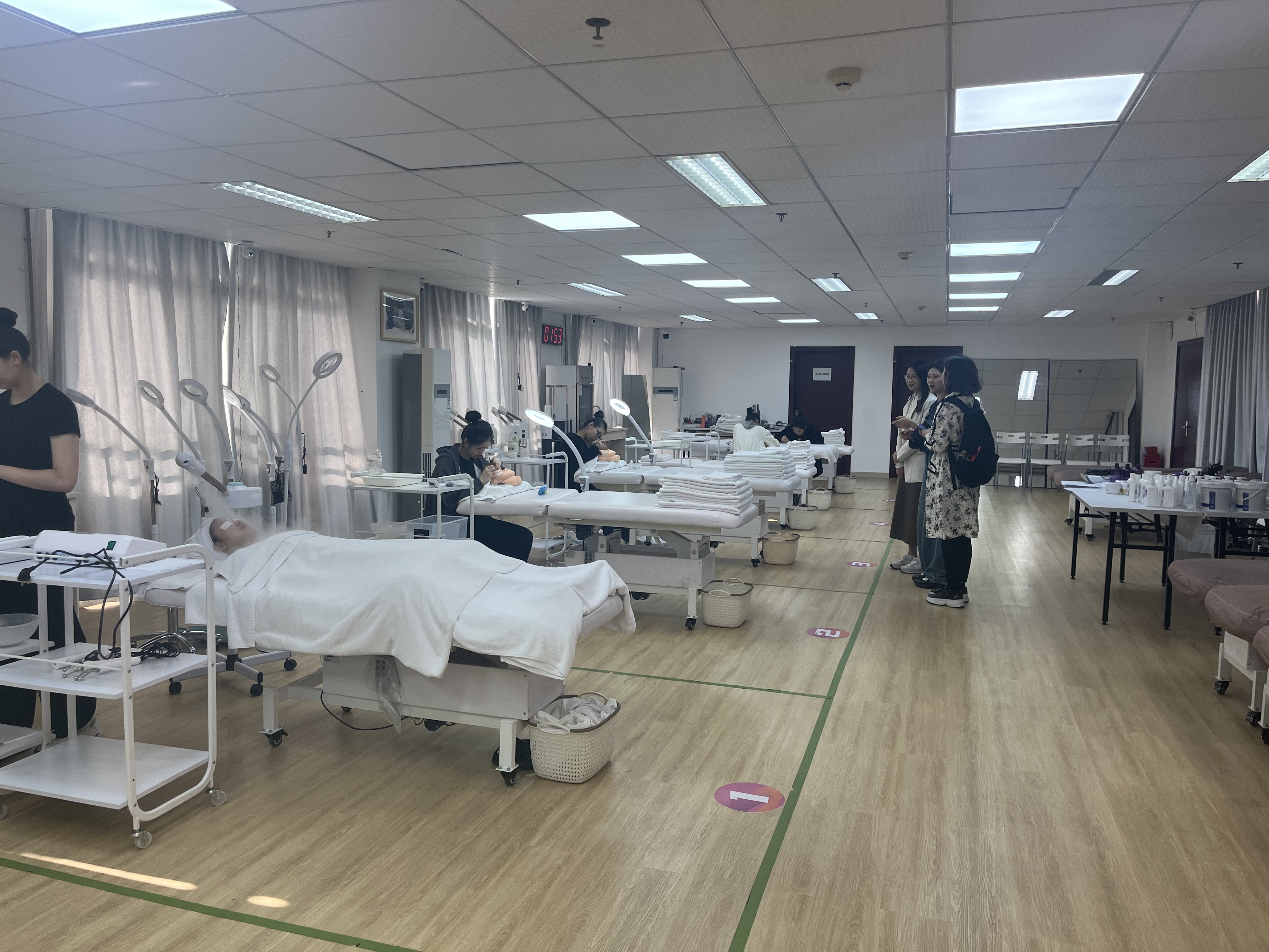 文小洁教练带领我们参观了世界技能大赛美容项目集训基地,文老师详细介绍了美容项目集训基地的文化建设、训练工位大小、设施设备布置等,并和詹晓珊老师进行了详细的交流。