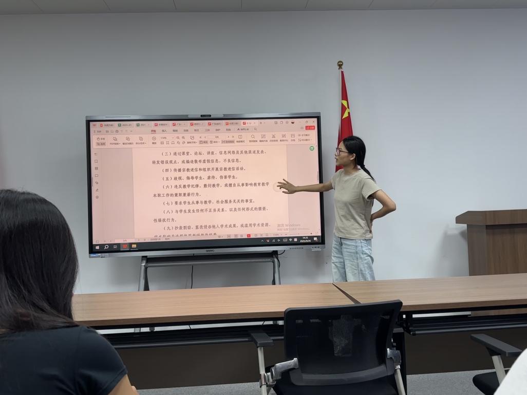 在专题学习环节,全体教师围绕三大核心内容展开深入学习。其一,聚焦师德师风核心内涵,系统学习教育家精神的时代价值与实践要求,明确教师在理想信念、道德情操、扎实学识、仁爱之心方面的具体标准,引导教师将个人成长与教育事业发展紧密结合;其二,通过剖析违反师德师风的典型案例,以 “反面教材” 敲响警钟,让教师深刻认识到师德红线不可触碰、职业底线不可逾越,进一步增强自律意识与责任意识;其三,逐条解读《教师职业行为负面清单与师德失范行为处理办法》等文件细则,明确教师在教育教学、学术研究、师生交往等方面的行为规范,确保每一位教师都清晰知晓 “可为” 与 “不可为” 的界限。