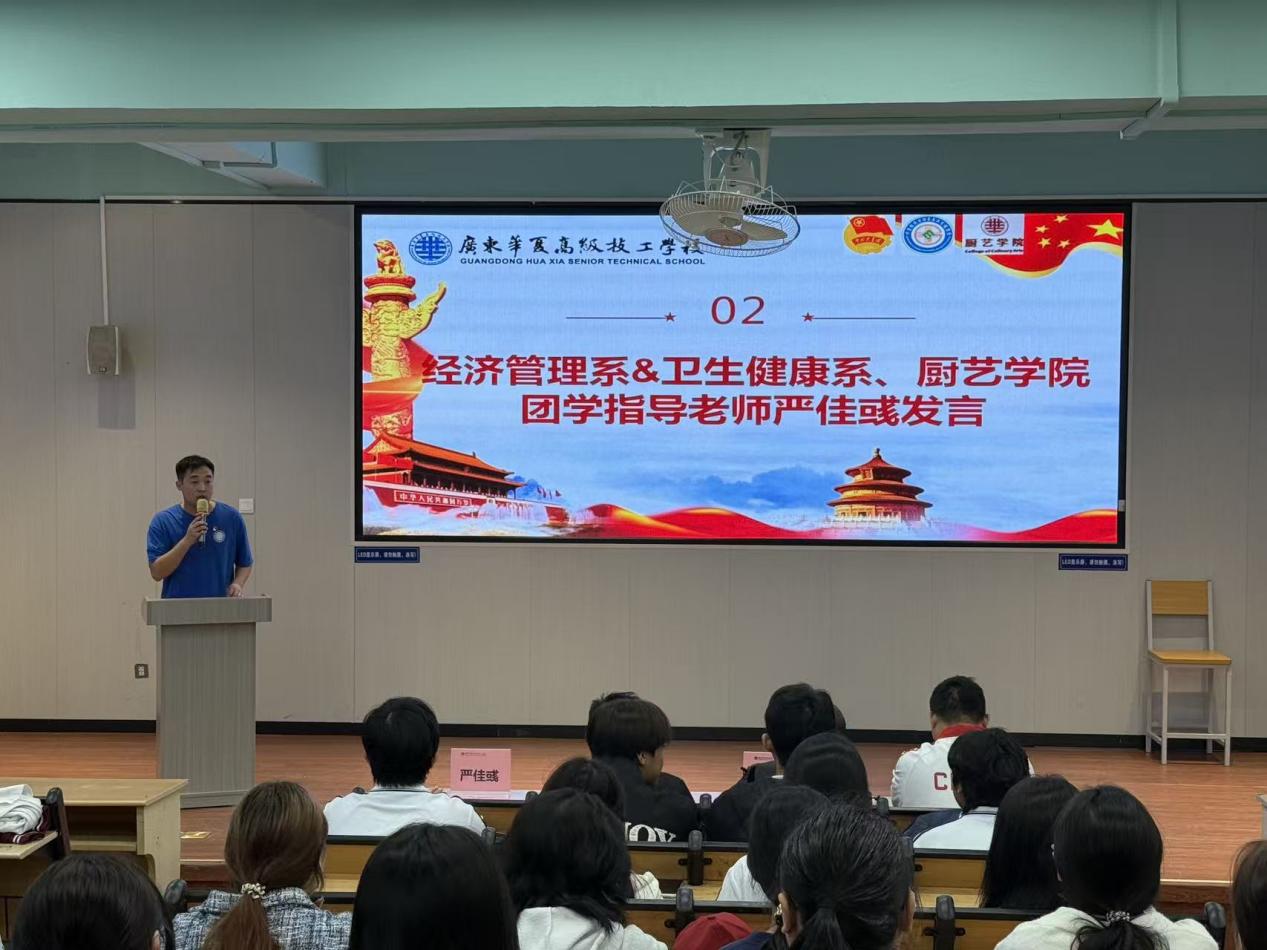 严老师介绍到,团学组织是学习成长的实验场;接着鼓励新同学脚踏实地、勇于创新,传承优良作风并积极服务奉献;然后列举了过去一年团学骨干的优异成绩和典型事例,号召大家向他们学习;最后祝愿大家在华夏书写属于自己的美好未来